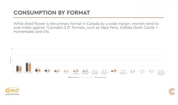 While dried flower is the primary format in Canada by a wide margin across the total population, women tend to over-index against “Cannabis 2.0” formats, such as vape pens, edibles (candies and homemade) and oils.