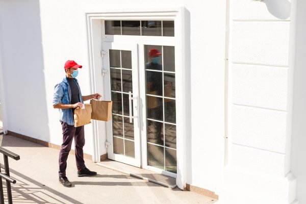 delivery guy in protective mask near the customer house, outdoors