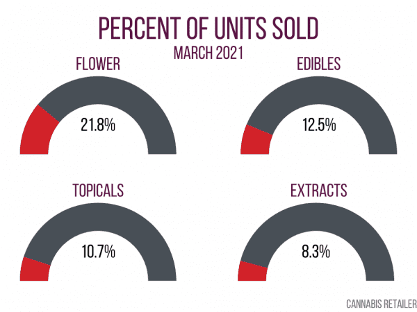 Extracts saw a similar spike in production in March, increasing 29.3% over the month before, while sales increased 11%, barely surpassing pre-holiday numbers. There were 12.6 million packaged units awaiting sale in March, but fewer than 1 in 10 were sold.