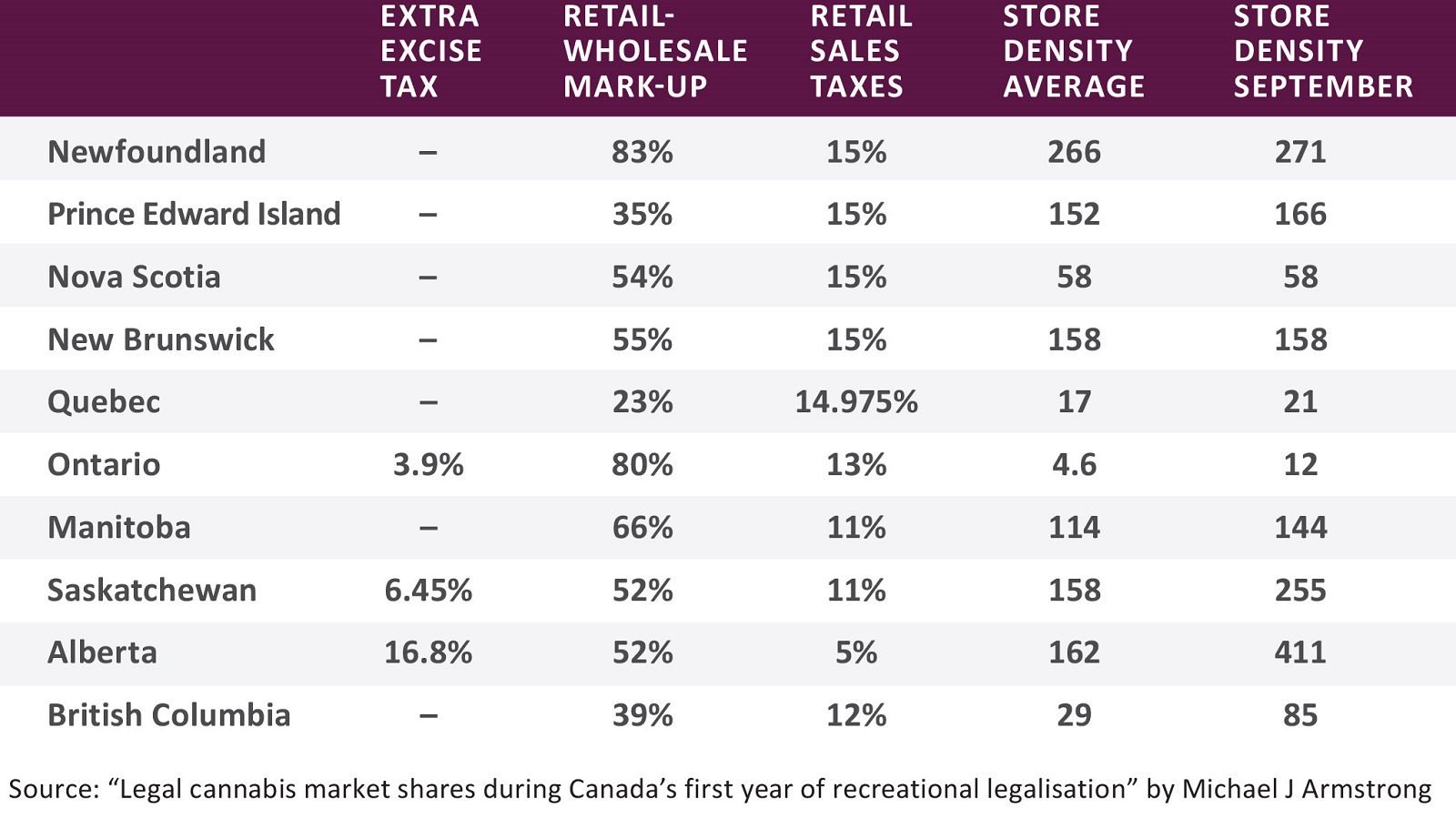 In Armstrong’s report “Legal cannabis market shares during Canada’s first year of recreational legalisation” he describes, “The first three columns show each province’s extra ad valorum excise tax (if any), its estimated combined retail-wholesale price mark-up, and its combined federal-provincial sales tax rate. The last two columns show the store density (in stores per million users), first averaged across all 12 months and then just for September 2019.”