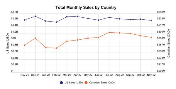 The Canadian cannabis market saw steady sales growth in 2022. As of November, sales are up 7% from a year ago.