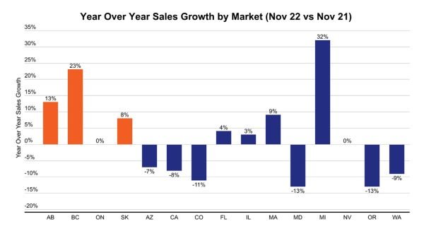 Not all markets performed in the same way over the past year. This graph shows the relative increase or decrease in total sales within each market, comparing November 2021 to November 2022. Most Canadian markets saw positive growth while Ontario, the largest province by population and total cannabis sales, was flat.