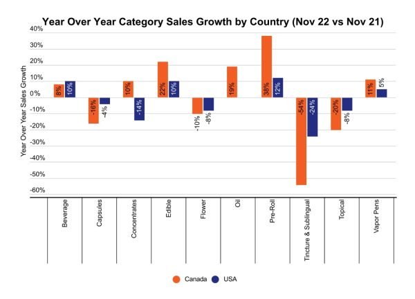 Beverages, Edibles, Vapor Pens, and Pre-Rolls all saw positive year over year growth in both the US and Canada. This again potentially indicates a shift in consumer behaviour towards more portable and shareable product types.
