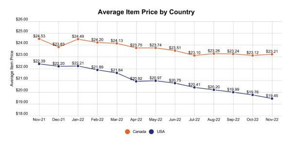 Due to historically large increases in inflation, pricing has been a popular topic of conversation throughout the year. In the cannabis industry however, prices are moving in the opposite direction. This graph shows the market-wide average price of a cannabis product by month from November 2021 to November 2022. Prices in the US have been decreasing steadily, dropping -13% since November 2021. In Canada, the decrease in price has been less steady, but average item prices in November 2022 are 5% lower than in November 2021.