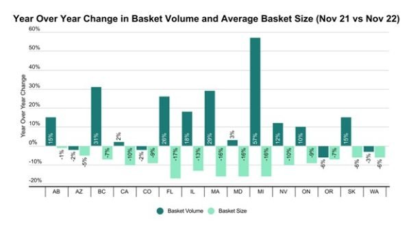 One of the best ways to understand how topline sales are changing is to look at basic basket metrics. Total sales can be described as the total number of transactions multiplied by the size of the average transaction. This graph shows us the year over year changes in both of these metrics within each US and Canadian cannabis market.
