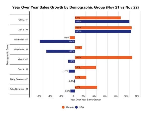 An interesting standout in this analysis is the growth of sales to Canadian Female Generation X customers. This cohort had the strongest growth of any in Canada, besting even Gen Z Male customers by one tenth of a percentage point. Canadian operators should continue to watch this trend as a previously untapped customer segment may be emerging.