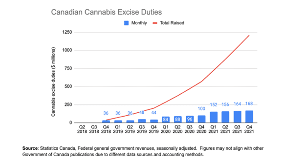 Since 2018, the legal cannabis sector has raised more than $1.2 billion in excise taxes, of which more than half ($640 million) were collected in 2021.