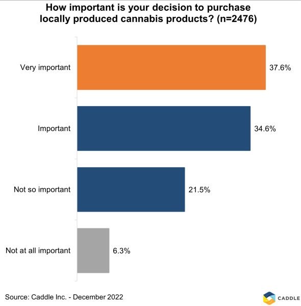 The decision to purchase local is important in many retail sectors and cannabis retail is no exception. In December, Cannabis Retailer commissioned Caddle to survey consumers. 37.6% of respondents stated that is very important to be able to purchase locally produced cannabis products and 34.6% rated it as important.