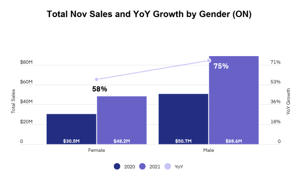 When comparing year-over-year sales between November 2020 and November 2021, Headset found that while male customers take more of the share of spending, both male and female customers increased their spending on cannabis products. Over the year, spending by those in the male category increased 75% from $50.7 million to $88.6 million and spending by those in the female category increased 58% from $30.5 million to $48.2 million.