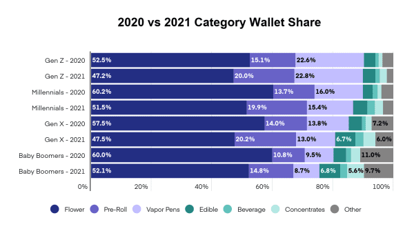 Millennials in 2020 devoted 60.2% of their wallet to flower and 13.7% to pre-rolls, but in 2021 flower’s share dropped 9% and pre-rolls increased to 19.9%, and Millennials showed a bit more interest in concentrates and edibles. Similar trends can be seen across the other categories, with older age groups gravitating away from smokeables to edibles.