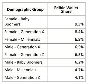 Based on sales in Alberta and Ontario over the past six months, there are substantial differences in purchasing behaviour according to generation. In general, older female customers tend to contribute more of their total cannabis spend on edible products while younger male customers are less likely to purchase edibles.