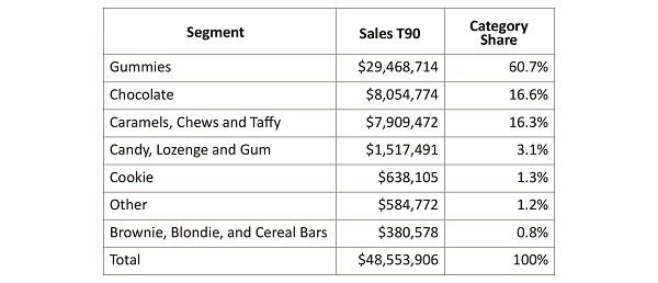 Gummies contributed well over half the total revenue to the category with Chocolate and Caramels, Chews, and Taffy being the only other two segments with significant category share. Gummies are the dominant format in US markets as well, likely due to their shelf stability, ease of manufacturing, and wide appeal.