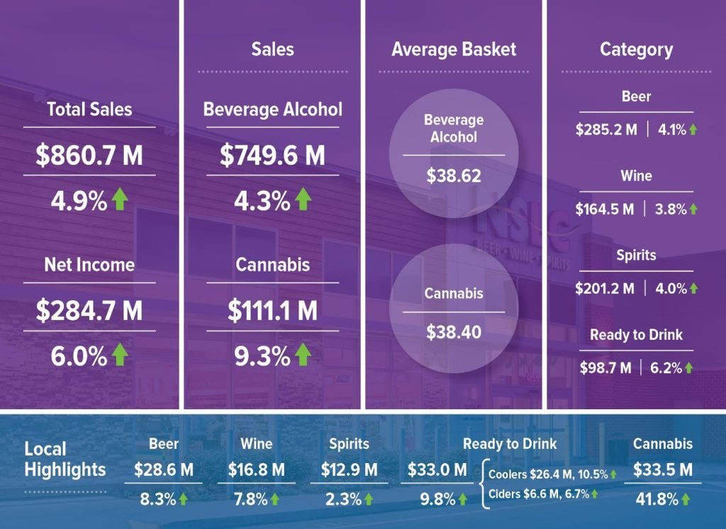 Nova Scotia Liquor Corporation (NSLC) released its year-end financial results for April 1, 2022 to March 31, 2023, reporting a 6% increase in earnings to $284.7 million. Total sales for the year were $860.7 million, with cannabis sales of $111.1 million.