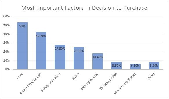 Price, ratio of THC to CBD, and safety of product were the three most important factors in respondents’ decisions to purchase a cannabis product. Terpene profile, presence of minor cannabinoids, and other reasons were the least.