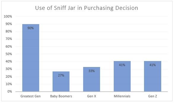 The majority of Greatest Gen use a sniff jar at 90% while the other generations were closer to the respondent average:
