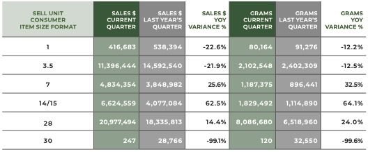 14-15 gram SKUs saw a notable increase in sales this quarter up 62.5% from the prior year to $6,624,559. 30-gram SKUs saw a drastic change with sales down 99.1% compared to Q2 2022.