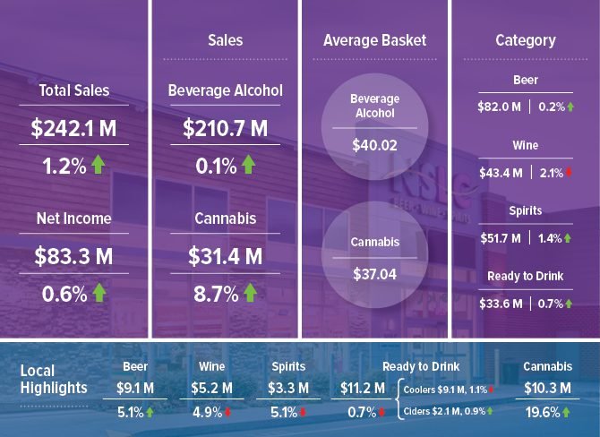 Total sales for the quarter were up 1.2% to $242.1 million with an increase in both beverage alcohol and cannabis. There was an 8.7% increase in cannabis sales to $31.4 million compared to a 0.1% increase in beverage alcohol sales to $210.7 million.