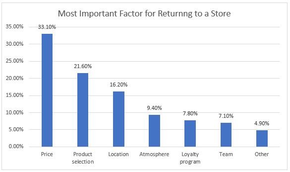 Respondents were also asked about the most important factors that bring them back to a certain store. Similar to the above question, price, product selection, and location were the top three factors, while loyalty program and team were the least.